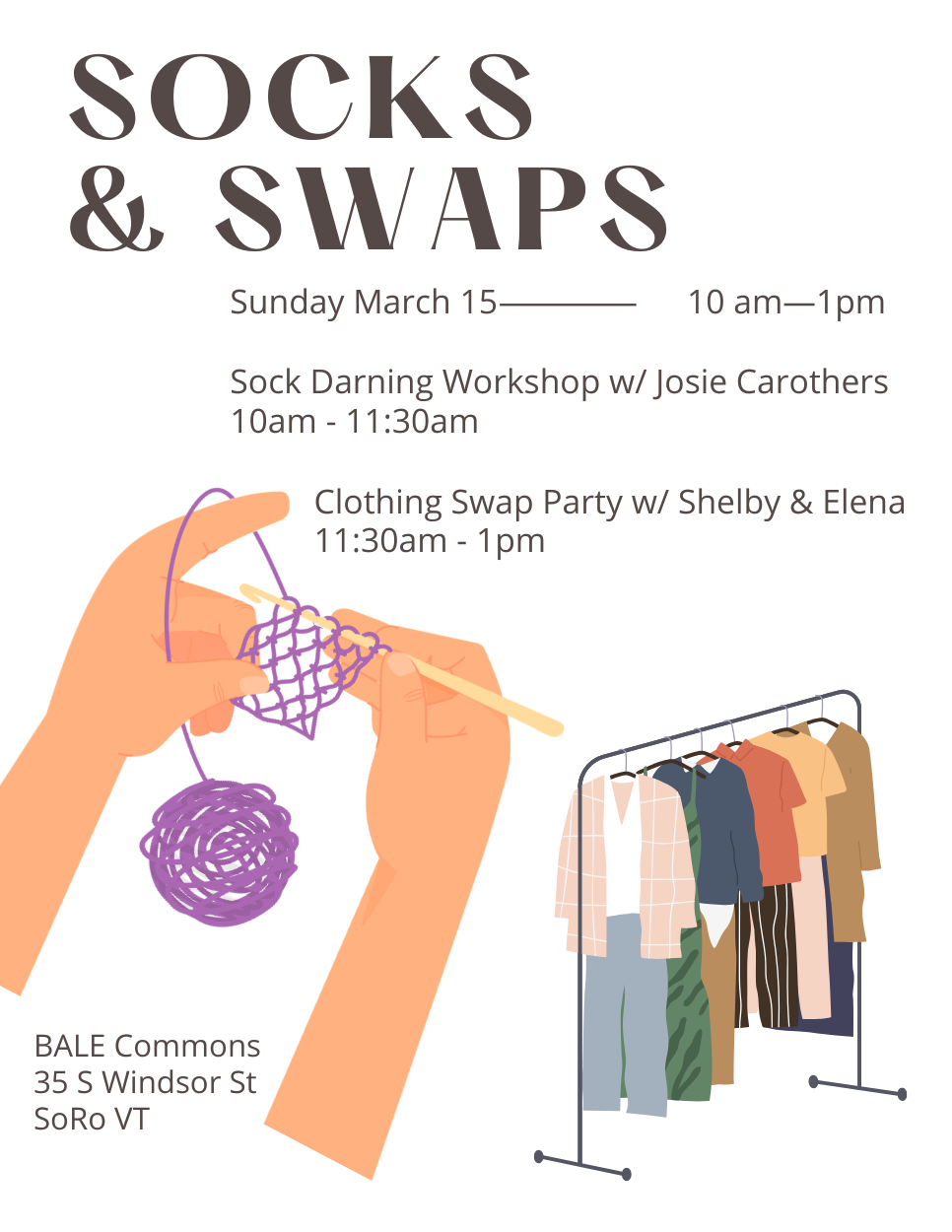 Clothing Swap party: bring up to 10 items in good condition to swap and come prepared to find some new threads while you make new friends! Unswapped items will be donated to the BALE Free Store so no need to take them back home.
