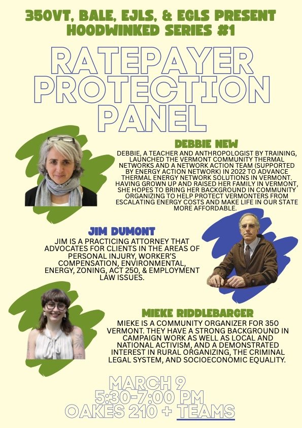 Monday March 9th 5:30pm - 7pm – Ratepayer Protection Panel presentation at VT Law and Graduate School at VLGS Oakes Bldg. room #210. Hosted & moderated by Earl Hatley. To join remotely on Teams follow this LINK.